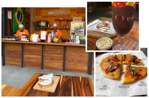 Delicious Brazilian food. Tapiocas, cheese bread (pao de queijo) , acai bowls, Brigadeiro’s and other gluten free goodies!